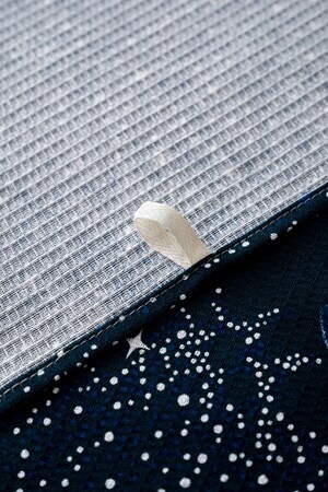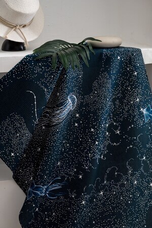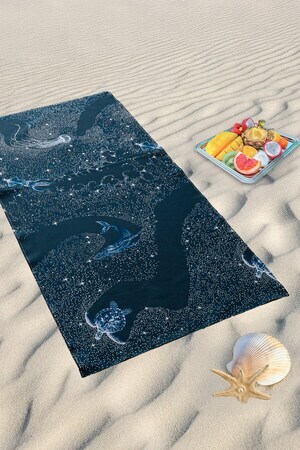 Полотенце представлено в двух цветах - синем и темно-синем, с узорами китов, медуз, черепах и звезд. Эти морские мотивы придают полотенцу особый шарм и делают его отличным подарком для любителей моря и пляжа.
