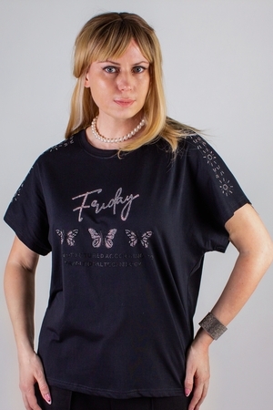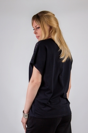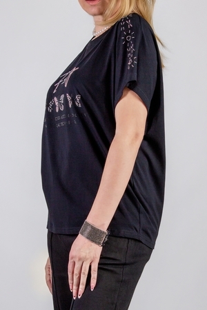 Благодаря сочетанию элегантного декора и универсального кроя, футболка прекрасно впишется в разные стилистические решения. Вариант с белой основой отлично смотрится с легкими юбками, джинсами и шортами, создавая свежий женственный образ для дневных прогулок. Черная расцветка выглядит более драматично и подойдет для вечерних выходов, если дополнить образ кожаными брюками или юбкой-карандаш и обувью на каблуке. В качестве аксессуаров можно выбрать минималистичные украшения и небольшую сумку через плечо – именно декор в виде бабочек станет центром внимания.