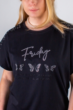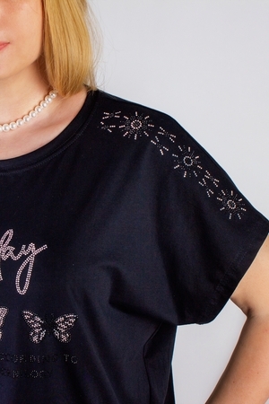 Главной особенностью этой футболки является выразительный декор из качественных страз. На каждом плече аккуратно выложены стразы, а на центральной части передней полочки – три изящных мотылька с надписями гармонично завершают сияющий ансамбль. Футболка представлена в двух цветах - на фоне белого полотна стразы смотрятся свежо и ярко, а на черном – благородно и сдержанно. При этом каждый элемент надежно закреплен на ткани профессиональной термофиксацией, что исключает осыпание страз при нормальном уходе и позволяет изделию долго сохранять первоначальный блеск и рельефность рисунка.