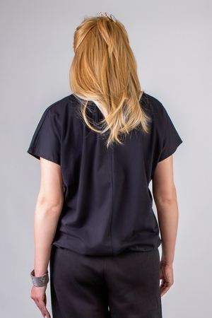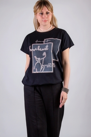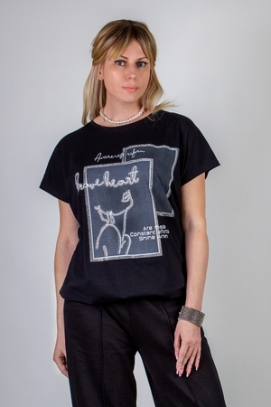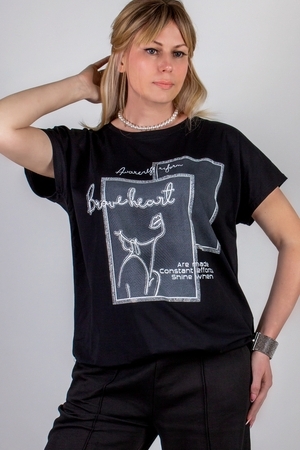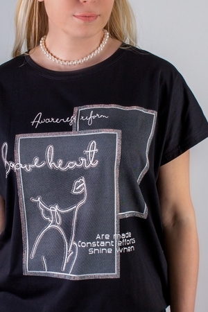Крой футболки продуман до мелочей: опущенная линия плеча создают свободный, но элегантный силуэт, который легко адаптируется под любую фигуру. Футболка идеально садится благодаря продуманному крою, подчёркивая достоинства и скрывая возможные недостатки. Черный базовый цвет делает модель универсальной и легко сочетаемой с любыми аксессуарами и низом гардероба. Центральный элемент дизайна – абстрактный принт из квадратов с изображением женского лица и выразительными надписями, обрамленный сверкающими стразами. Они добавляют праздничного блеска, подчеркивают художественный характер рисунка и ловят свет при каждом движении.