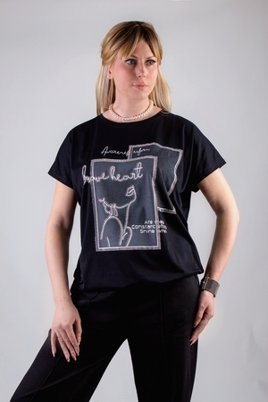 Уход за изделием прост: деликатная стирка при температуре до 30°С, гладить с изнаночной стороны через тонкую ткань, чтобы сохранить яркость принта и блеск страз. Такая футболка станет ярким акцентом в вашем гардеробе и будет радовать вас качеством, стилем и комфортом каждый день.