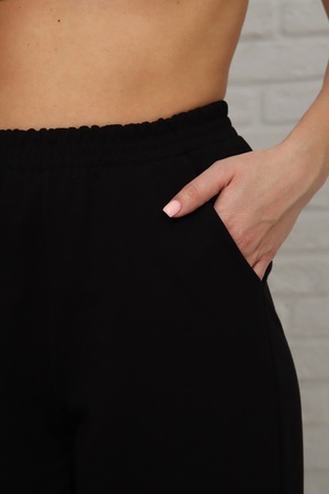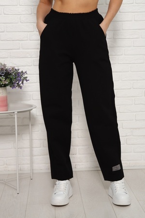 Черные трикотажные брюки силуэта "бананы". Трендовая модель из маломнущегося материала. Комфортный эластичный пояс и удобные по глубине карманы.