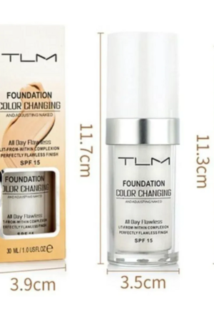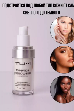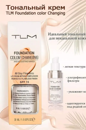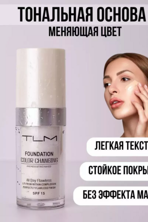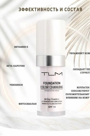 Тональная основа имеет легчайшую структуру. Флюид мгновенно впитывается в кожу, не оставляя следов и чувства липкости. Крем не течет, не смазывается, не подчеркивает шелушения. Добавочные компоненты – коллаген и фитоэкстракты- смягчают и питают дерму, придавая ей ухоженный и здоровый вид. Тональная основа подходит для маскировки незначительных недостатков. Мелкие прыщики, синяки под глазами или покраснения она скроет без проблем. Для более серьезных дефектов – следов от акне, рубцов и шрамов- потребуется крем консистенции поплотнее. У флюида нет ярко выраженного цветового пигмента. В бутылочке средство имеет белый цвет, но попадая на кожу, адаптируется под родной оттенок. В состав крема входят капсулы, созданные по специальной технологии – изменять цвет непосредственно на коже. TLM Foundation color Changing – прекрасный выбор для тех девушек, которые не могут подобрать тональное средство, подходящее по тону. Универсальный крем подойдет и смуглянкам, и белоснежкам. Легкая текстура крема – идеальная основа для летнего макияжа, когда лицо не хочется перегружать избытком косметики. Крем включает ультрафиолетовые фильтры, предупреждающие чрезмерное влияние солнца на кожу. По способу нанесения и ощущениям на лице тональник больше похож на ВВ-крем. Продукт экономно расходуется – у флакончика удобный дозатор, выдающий средство буквально по горошине. Объем – 30 мл.