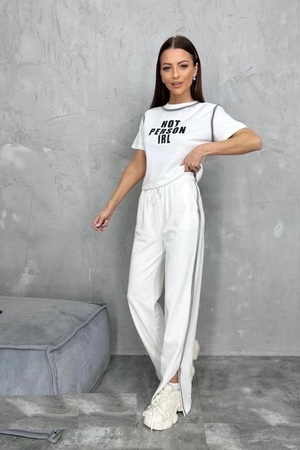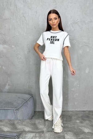 Женский костюм выполнен из футера высокого качества с хлопком и небольшим добавлением полиэстера и лайкры, что позволяет изделию не скатываться и оставлять идеальный внешний вид на долгое время. Костюм состоит из футболки с принтом и брюк с разрезами по бокам. Брюки на резинке с вместительными боковыми карманами.