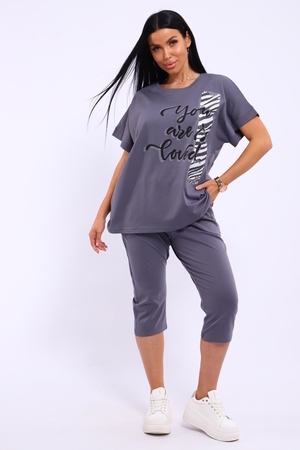 Универсальный костюм с бриджами, изготовленный из качественного хлопкового трикотажа идеально подходит для самых разных вариантов использования. Он может быть одеждой для сна, домашним нарядом, а так же костюмом для времяпровождения на свежем воздухе. Майка достаточно объёмная, чтобы не сковывать движений, полочка украшена броским принтом. Благодаря использованию мягкого трикотажа из 100% хлопка, вы будете наслаждаться комфортом и уютом в любой ситуации.