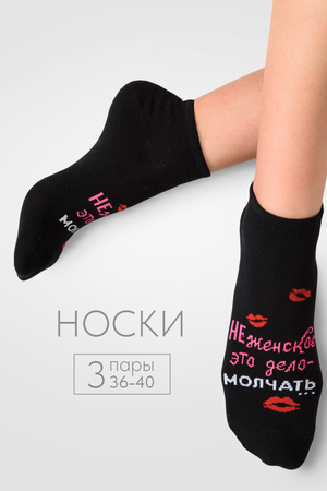 Короткие женские носки с оригинальной надписью. Отлично подойдут в качестве подарка на 8 марта и по любому поводу. В упаковке 3 пары.