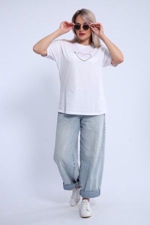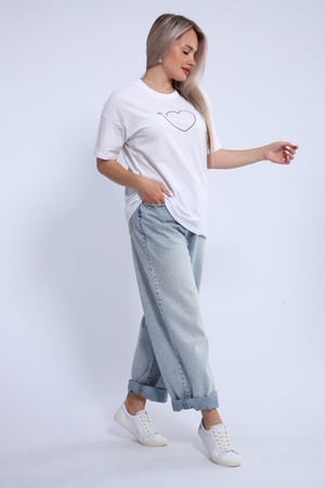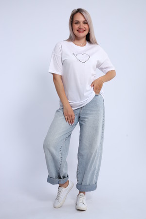 Футболка для женщин прямого силуэта, длиной до середины бедер. Рукав втачной, короткий. Горловина округлой формы. Полочка футболки украшена принтом.
