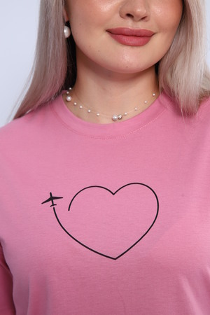 Футболка для женщин прямого силуэта, длиной до середины бедер. Рукав втачной, короткий. Горловина округлой формы. Полочка футболки украшена принтом.