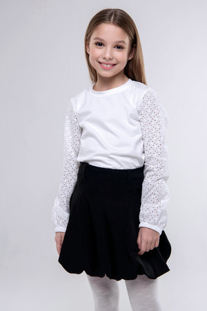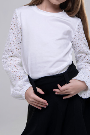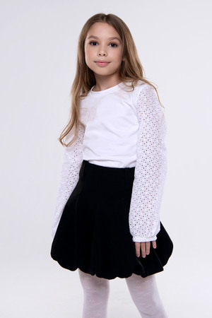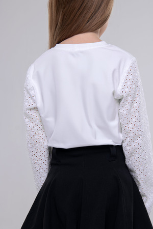 Элегантная белая блузка с ажурными рукавами – стильный выбор для школы и особых случаев. Удобная и изящная, она добавит утонченности любому образу.