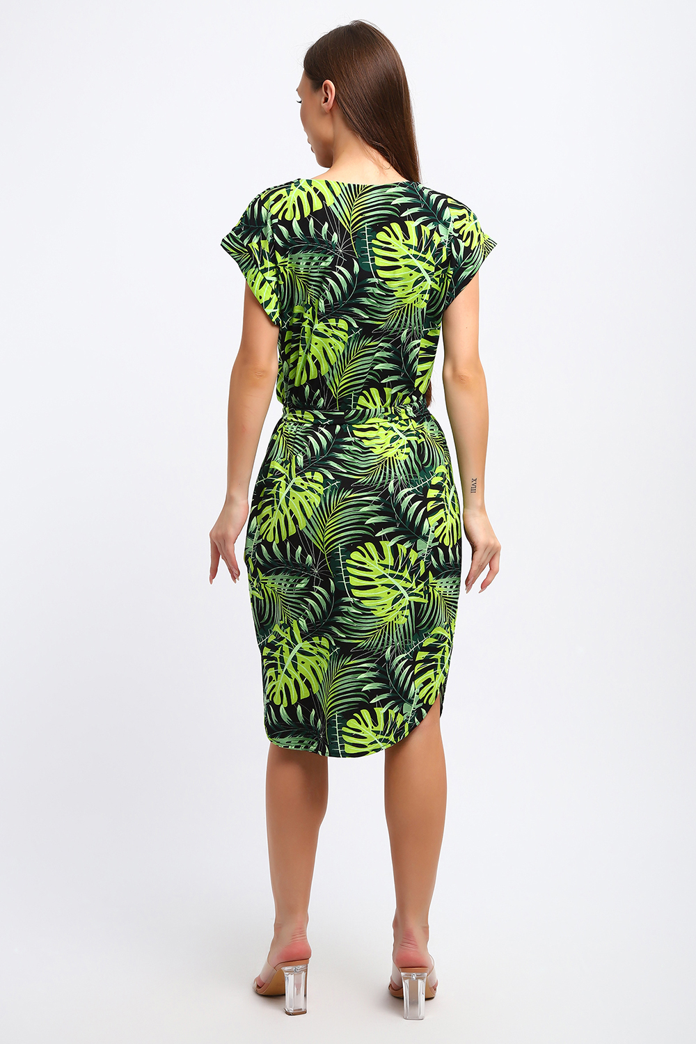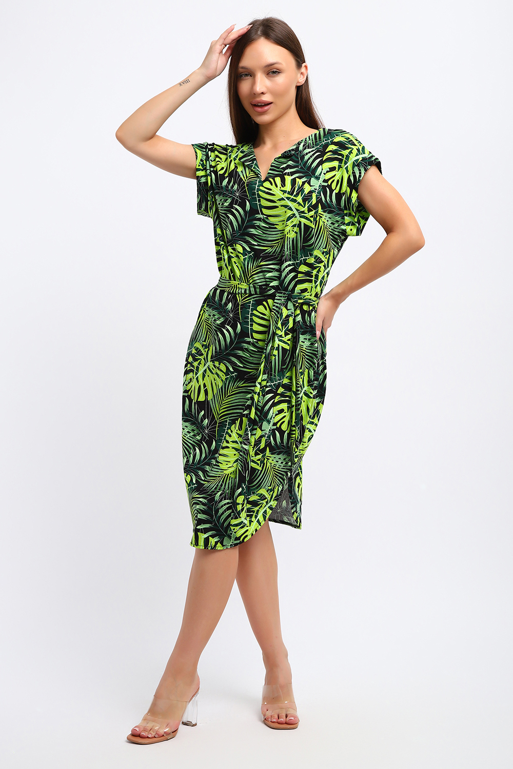Платье-туника летнее выполнено из трикотажного полотна, кулирка 100% хлопок. Платье полуприлегающего силуэта умеренного объёма с коротким цельнокроеным рукавом. Спинка и полочка цельнокроеные, вырез горловины круглый спереди разрез. Срез горловины спинки и полочки обработан подкроенной обтачкой из основной ткани. Срез проймы обработан манжетой. Длина платья до линии колена, по боковым швам округленные разрезы. Платье имеет пояс. Большой размерный ряд поможет подобрать платье на любую фигуру, для стройных и для полных. Платье подчеркнёт достоинства и скроет недостатки фигуры, подарит комфорт и удобство в жаркий летний день, в отпуске, на пляже.
