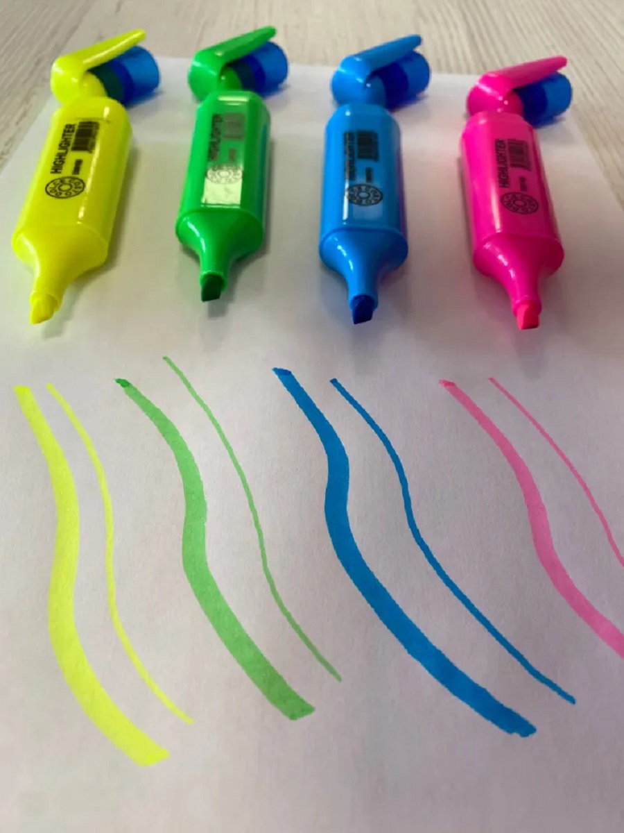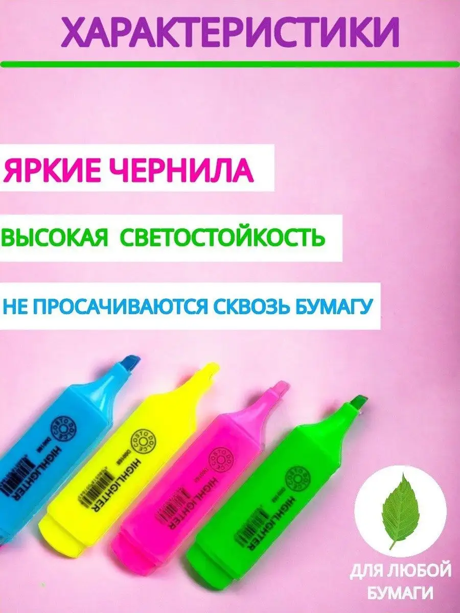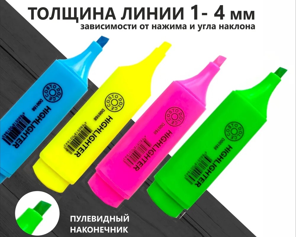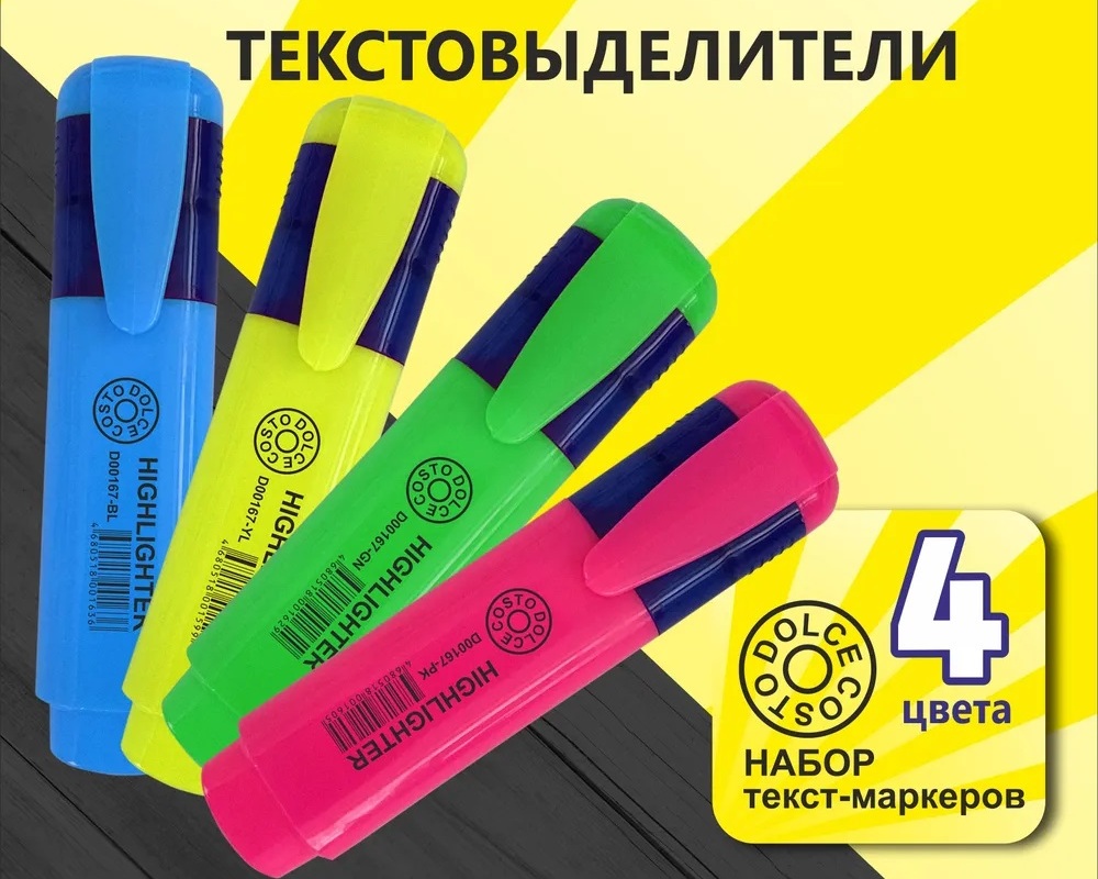 Текстовыделители – отличные помощники для выделения нужных слов на учебе или офисной работе. Набор содержит 4 насыщенных флуоресцентных цвета в ПВХ-чехле. Выделители текста пишут гладко и ровно. Подходят для разных типов бумаги, включая тонкую. Скошенный наконечник текстовыделителей даёт возможность регулировать толщину линий — от 1 до 4 мм. Чернила на водной основе экономично расходуются и быстро высыхают на бумажной поверхности. Не оставляют следов на обратной стороне листа. Корпус эргономичной формы из пластика удобно держать. Набор текстовыделителей идеален для университета или школы.Набор текстовыделителей с флуоресцентными чернилами на водной основе. Выделители текста имеют удобный клип. Цвет торцевого элемента соответствует цвету чернил маркера. 4 штуки текстовыделителей упакованы в прозрачный ПВХ чехол. Нежные цвета: желтый, голубой, розовый, зеленый. Текстовыделители отличные помощники для выделения нужных слов на учебе или офисной работе. Набор содержит 4 насыщенных флуоресцентных цвета .