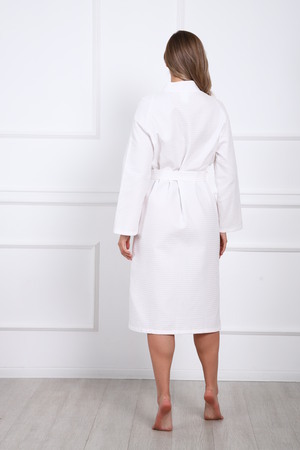 Модель халата: кимоно с воротником типа планка, длинными рукавами, накладными карманами, поясом. Фасон кимоно имеет свободный крой, отсутствуют какие-либо застежки, широкие рукава. Халат идеально сядет на любую женскую фигуру. Предназначение халата: для дома, бани, сауны, бассейна, spa-процедур.