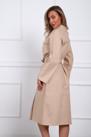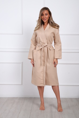 Модель халата: кимоно с воротником типа планка, длинными рукавами, накладными карманами, поясом. Фасон кимоно имеет свободный крой, отсутствуют какие-либо застежки, широкие рукава. Халат идеально сядет на любую женскую фигуру. Предназначение халата: для дома, бани, сауны, бассейна, spa-процедур.
