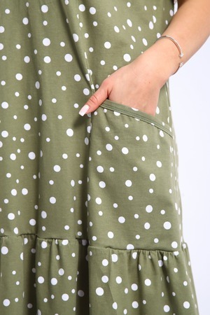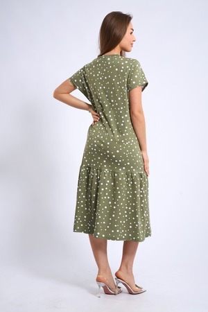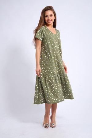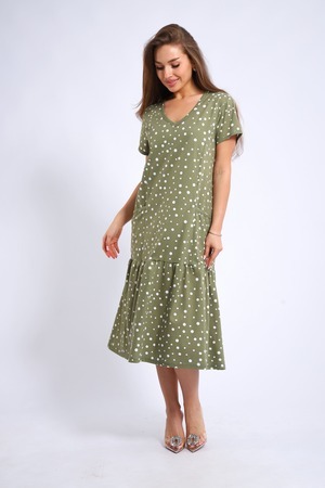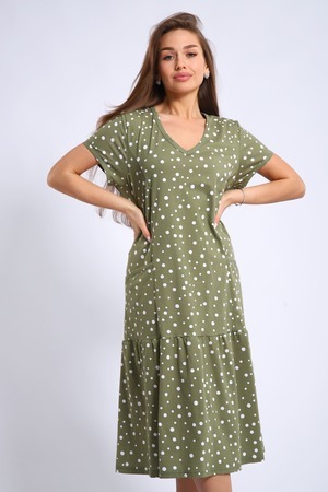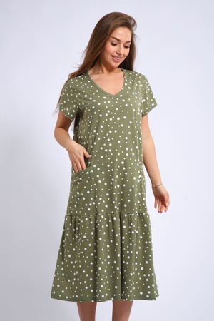 Платье женское выполнено из набивного трикотажного полотна кулирка. Платье свободного силуэта, с коротким рукавом. Вырез горловины "намыс", накладные карманы. По низу оборка.