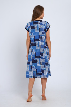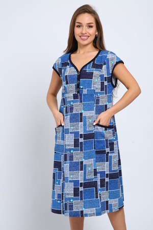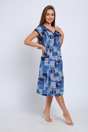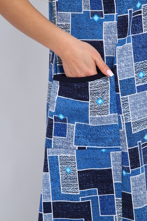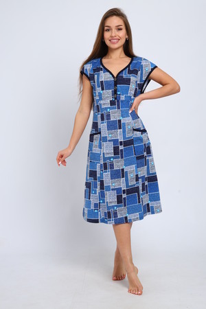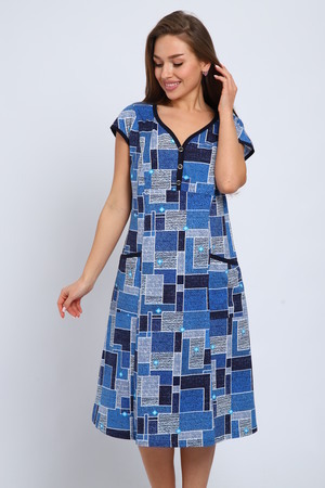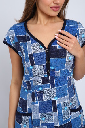 Платье женское выполнено из набивного трткотажного полотна кулирка. Силуэт свободный. Плечо спущенное. Подрез под грудь. На груди застежка на пуговицах до подреза. Карманы в боковых швах.