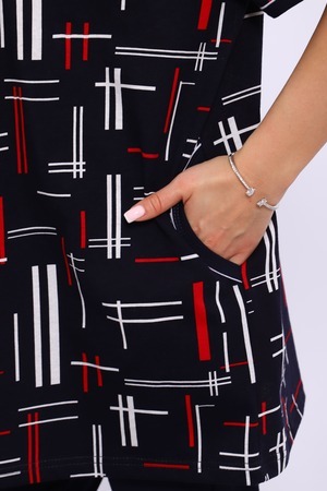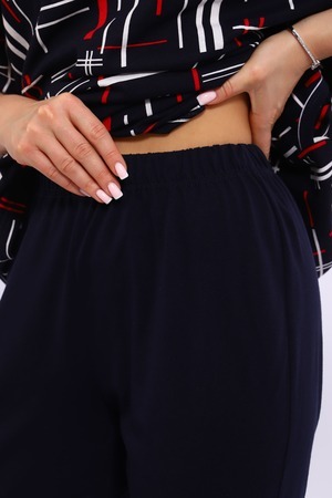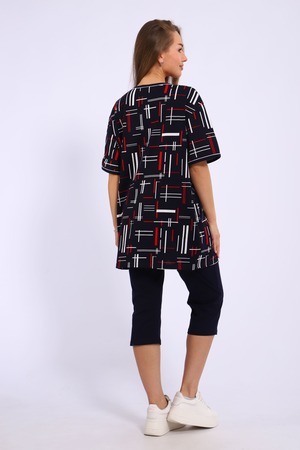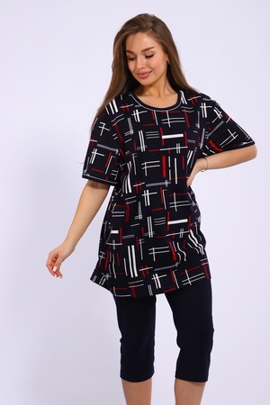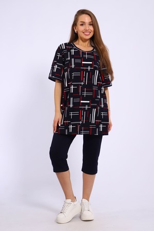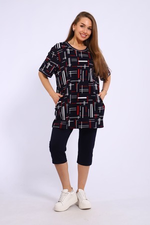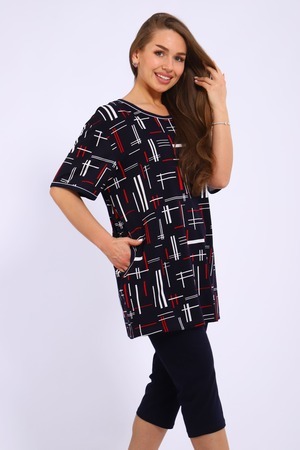 Костюм женский выполнен из трикотажного полотна кулирка. Костюм состоит из футболки и бридж. Футболка свободного силуэта с карманами в боковых швах, рукав короткий, горловина, низ рукава, вход в карман окантованы двойным кантом Бриджи прямые, цельнокраенный пояс на резинке.