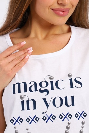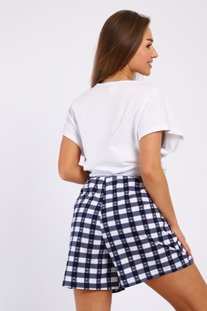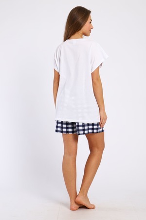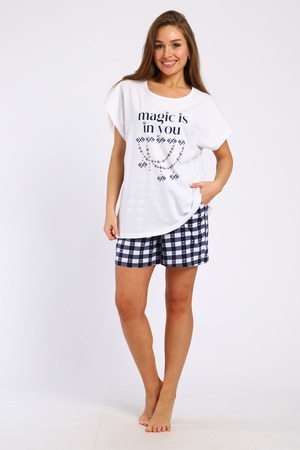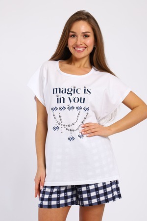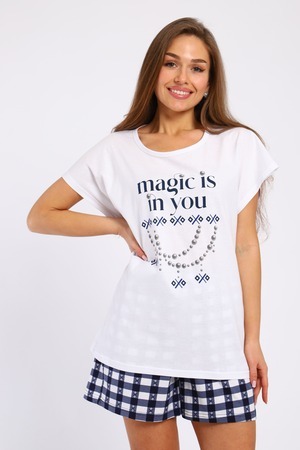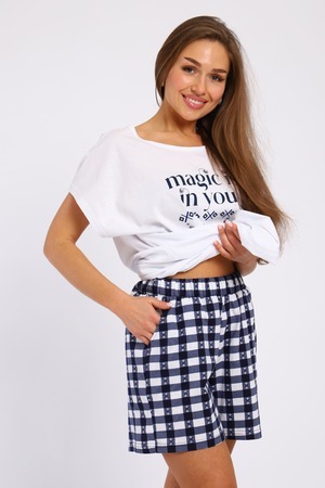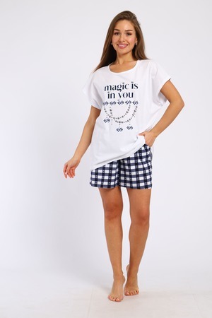 Костюм с шортами выполнен из трикотажного полотна кулирка. Костюм состоит из футболки и шорт. Футболка свободного силуэта, спущенное плечо, углубленная пройма, горловина окантована, на полочке выполнена печать. Шорты с притачным поясом на резинке, карманы в боковых швах.
