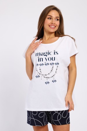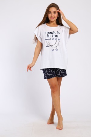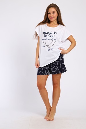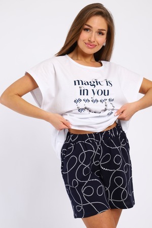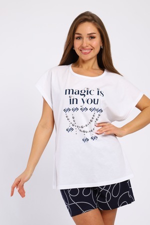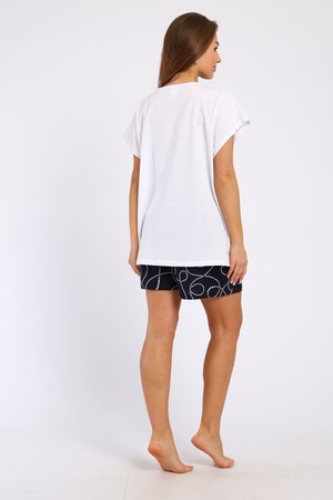 Костюм с шортами выполнен из трикотажного полотна кулирка. Костюм состоит из футболки и шорт. Футболка свободного силуэта, спущенное плечо, углубленная пройма, горловина окантована, на полочке выполнена печать. Шорты с притачным поясом на резинке, карманы в боковых швах.