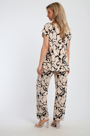 Костюм женский выполнен из кулирки 100% хлопок, состоит из футболки со спущенным плечом и брюк. Брюки свободного кроя на поясе, горловина футболки обработана узким кантом. Костюм очень комфортный, удобный, идеально подойдет как для прогулок, так и для дома и отдыха.