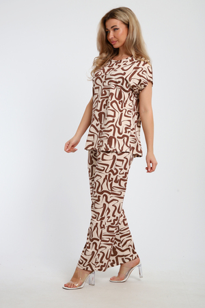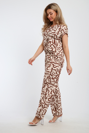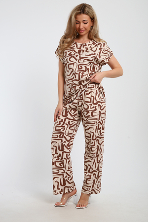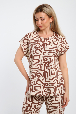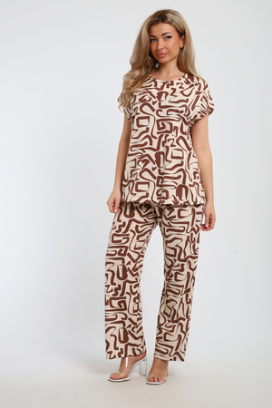 Костюм женский выполнен из кулирки 100% хлопок, состоит из футболки со спущенным плечом и брюк. Брюки свободного кроя на поясе, горловина футболки обработана узким кантом. Костюм очень комфортный, удобный, идеально подойдет как для прогулок, так и для дома и отдыха.
