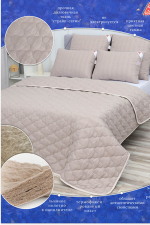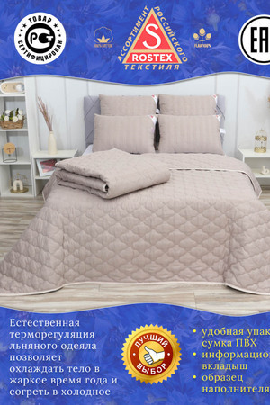 Одеяло Лён, стёганное на многоигольной машине из высококачественной ткани страйп-сатин, наполнитель натуральное термоскреплённое волокно лён пласт. Льняное волокно это плотный однородный наполнитель, не портится со временем, хорошо держит форму, гипоаллергенный, обладает антисептическими свойствами и хорошей терморегуляцией, не боится моли, долго служит. Естественная терморегуляция волокон позволяет охладить тело в жаркое время года и согреть в холодное.