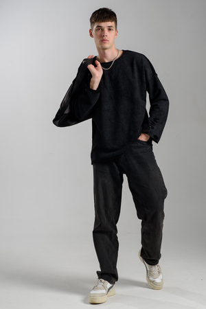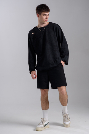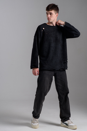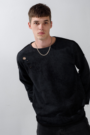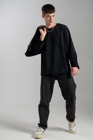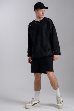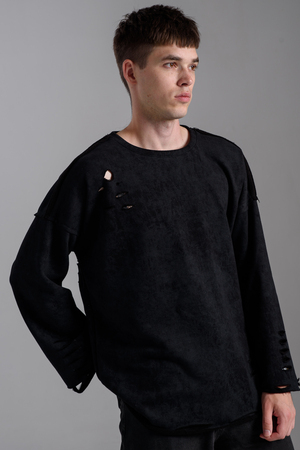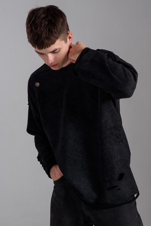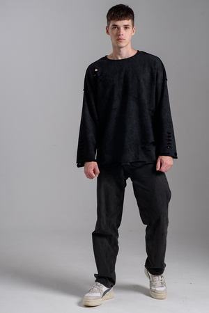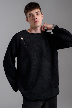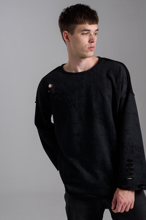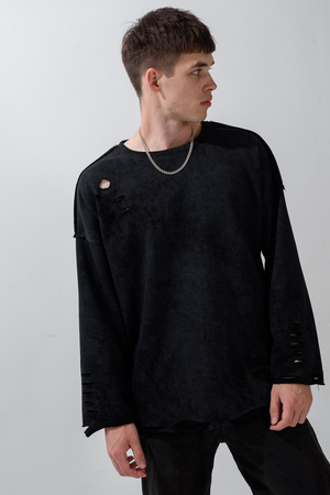 Стильный мужской свитшот в современном дизайне станет отличным дополнением к вашему гардеробу. Изготовлен из мягкого трикотажа, обеспечивает комфорт и тепло прохладными летними вечерами и осенью. Отличается характерной рваной текстурой, что придает ему необычный и оригинальный вид. Легко сочетать с другими элементами одежды. Конструкция рваного свитшота с широкими спущенными плечами и свободным кроем создает расслабленный оверсайз силуэт, что идеально подходит для кэжуал образов. Вырез горловины выполнен в классическом стиле, добавляя простоты и элегантности. Детали дизайна включают в себя необычные прорези, которые подчеркивают гранжевую эстетику. Прекрасно подойдет как для мужчин, так и для женщин, благодаря своему унисекс крою. Также будет уместен в молодежной моде и станет отличным вариантом для создания парных образов.
