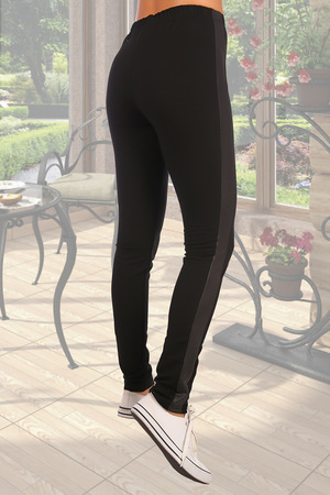 Трико из черного футера с лайкрой с кожанными лампасами, посадка на талии, легко впишется в любой модный и спортивный образ