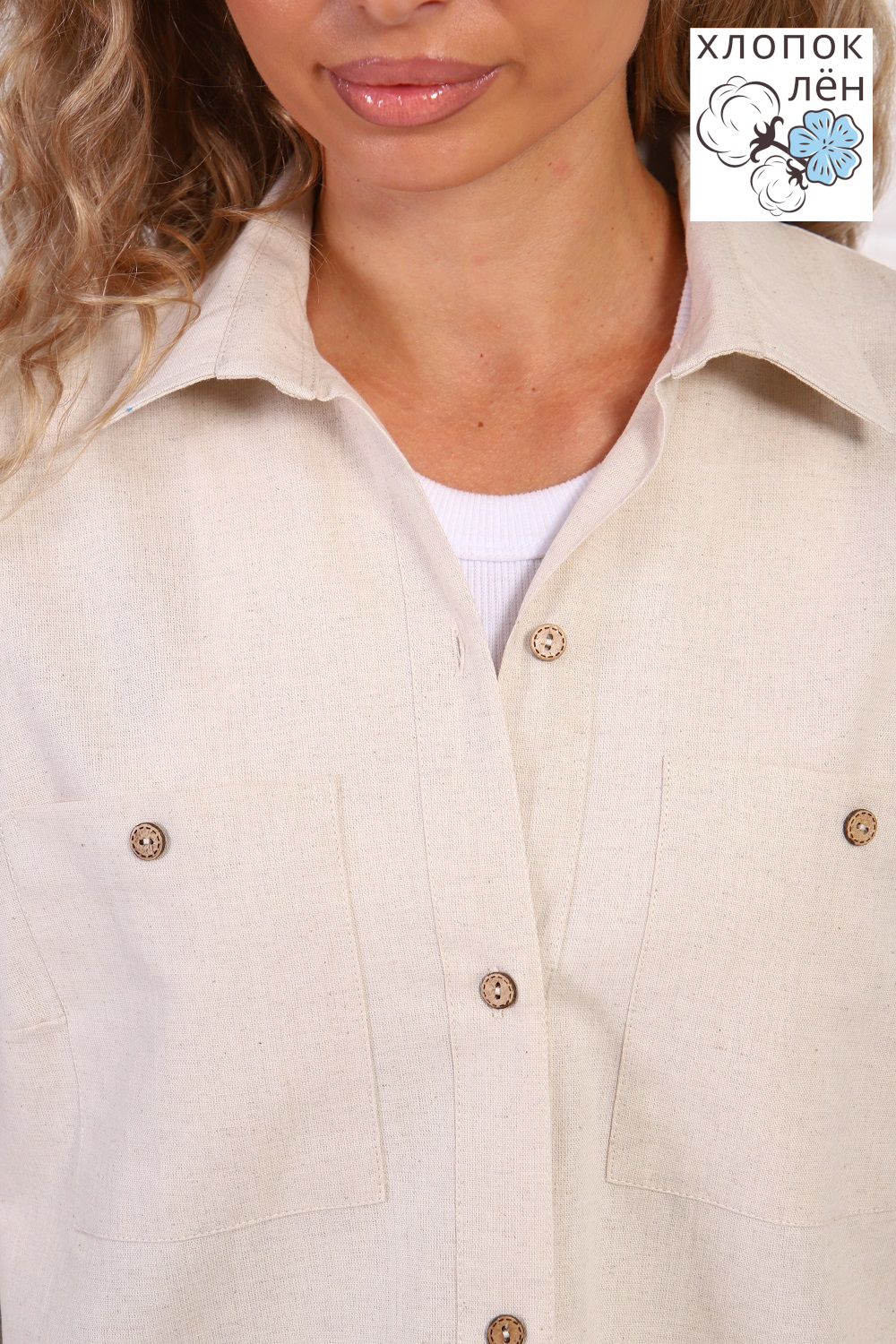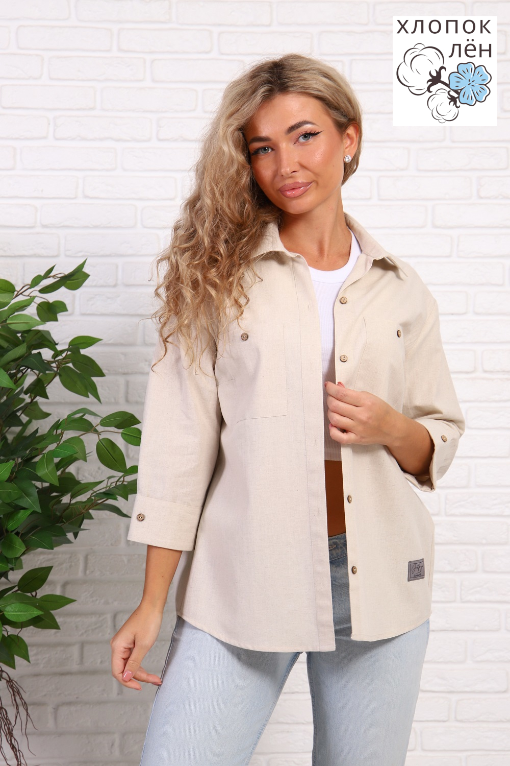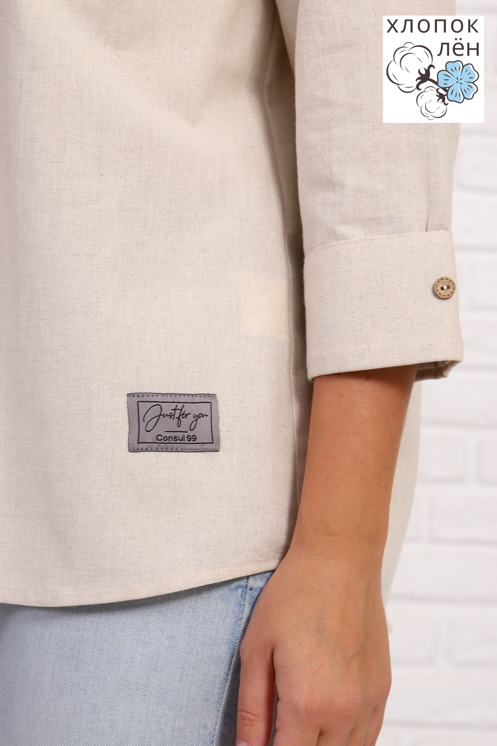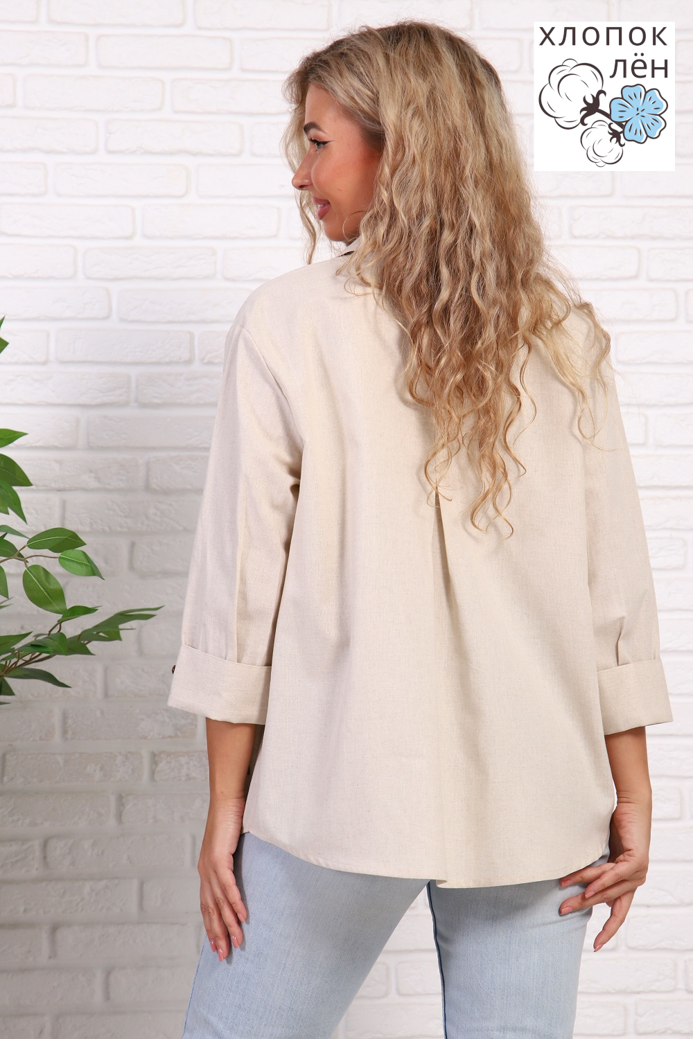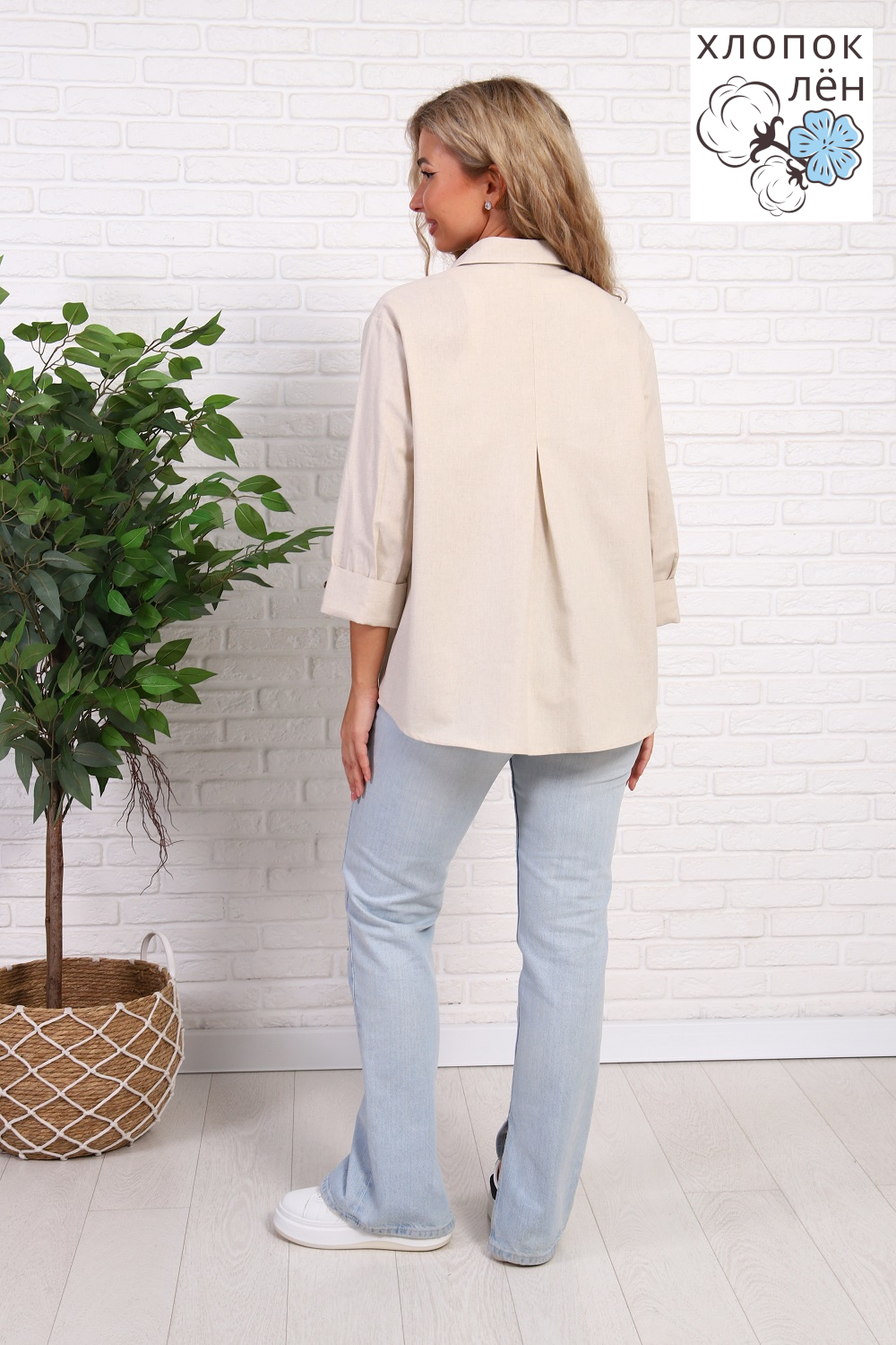 Рубашка женская офисная, свободного силуэта, 3/4 рукав. Из 100% натуральной ткани (хлопок 70% и лён 30%). Рубашка очень комфортная: рукава не сковывают движения; удобная длина, прикрывающая зону бедер; дышащая ткань. Трендовый силуэт и акцентные кокосовые пуговицы создают стиль этой рубашки. Сочетается и с денимом и с классической одеждой.