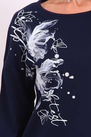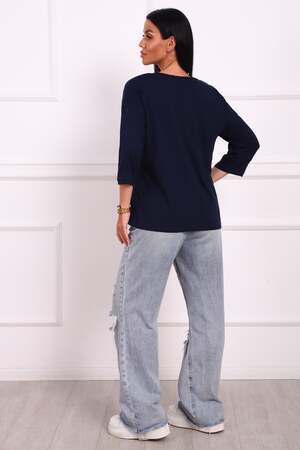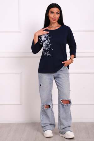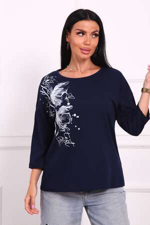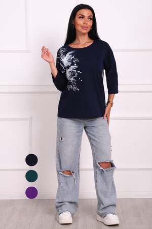 Туника женская. Ткань кулирка, хлопок 100%. Крой свободный, горловина круглой формы, обработана окантовкой. Линия плеч спущена. Длинна рукава 3/4, со швом по локтю. Низ изделия прямой. На полочке принт, шелкография.