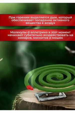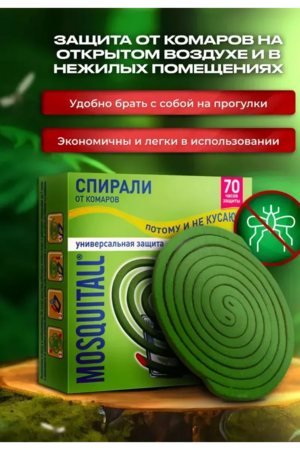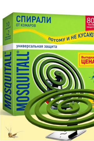 Средство для борьбы с комарами и другими кровососущими насекомыми имеет форму спирали, изготовленной из специальной пасты. Предназначены для использования на открытом воздухе: на даче, на пикнике, у водоема и в походах с целью защиты от укусов и для отпугивания летающих насекомых. Спирали от комаров москитолл универсальная защита предназначены для уничтожения комаров, москитов, мошек и других кровососущих насекомых. Действие средства начинается через 10-15 минут после начала тления спиралей от комаров. Одной спирали репеллента хватит на 10 часов активной работы на улице, веранде, на пикнике, у костра, на даче. Спирали Универсальная защита устанавливаются в разные места. Рекомендуется устанавливать спираль не ближе 1 метра от человека. При поджигании и последующем тлении ядовитый дым не позволяет комарам приблизиться к человеку, находящемуся на пикнике, в походе, на рыбалке, на террасе или веранде загородной резиденции, а также других открытых пространствах. Отпугиватель комаров устанавливается на специальную металлическую подставку, которая идет в комплекте к набору спиралей в коробке. Время полного сгорания спирали 6-7 часов. В любой момент спираль можно затушить и зажечь снова когда придет время. Хранить спирали следует аккуратно, в заводской упаковке. При работе прибора нельзя трогать спираль руками и металлическими предметами. С осторожностью следует применять средство инсектицидное при детях до 3 лет и при людях с заболеваниями дыхательных путей и склонных к аллергии. Диаметр спирали: 11 см. Количество спиралей: 10 шт в коробке х 2 коробки Размер подставки: 5 см х 3,5 см х 0,1 см.