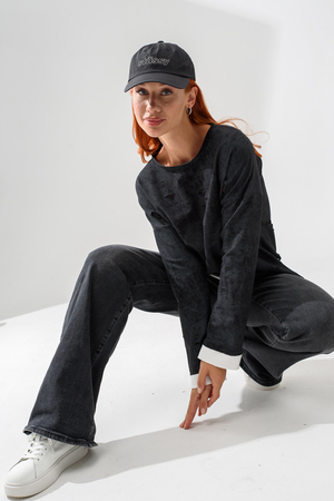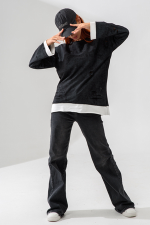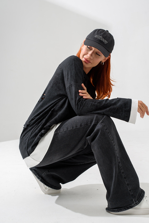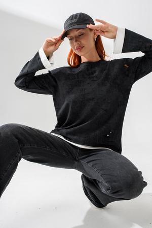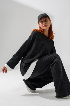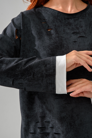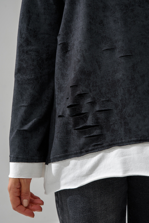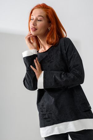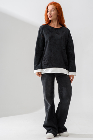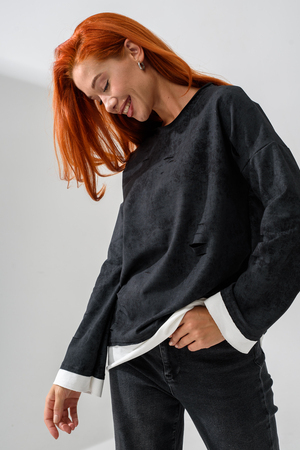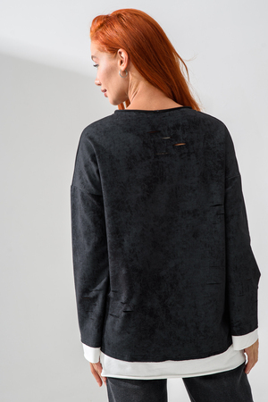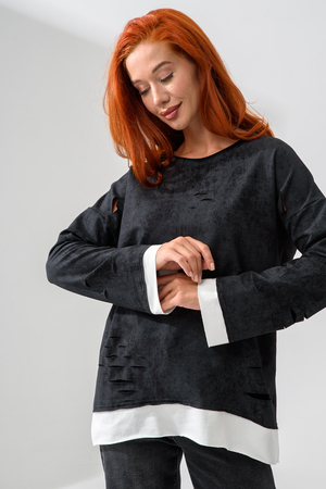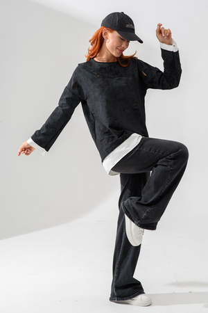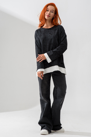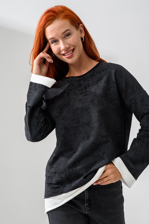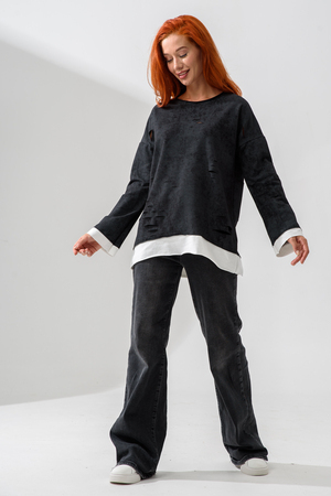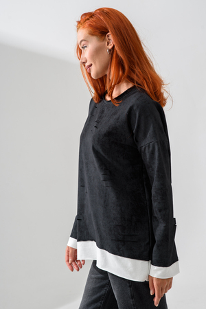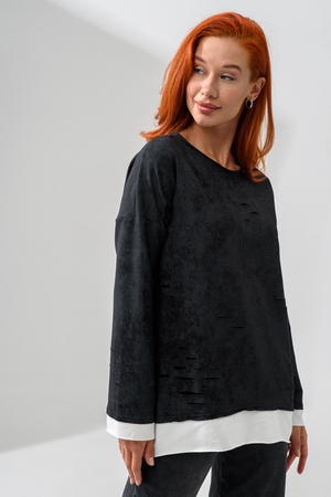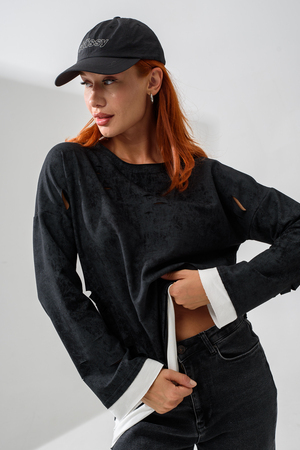 Женский лонгслив свободного кроя - эксклюзивная разработка с эффектом второго слоя. Очень современный дизайн! Особое внимание уделено деталям: необработанная горловина, края рукавов и низа, эффект многослойности придает изделию современный минимализм.