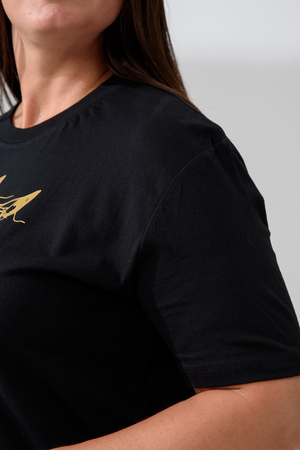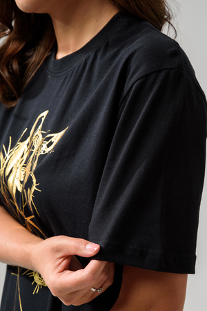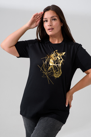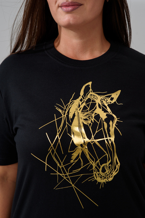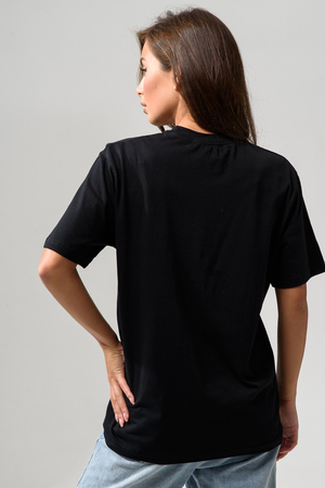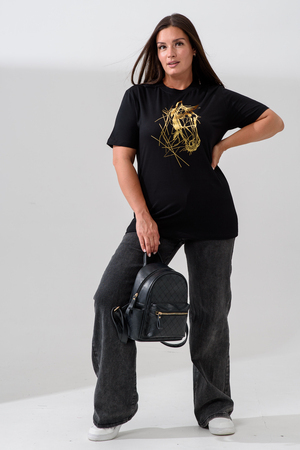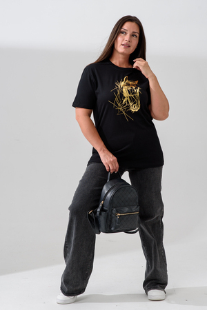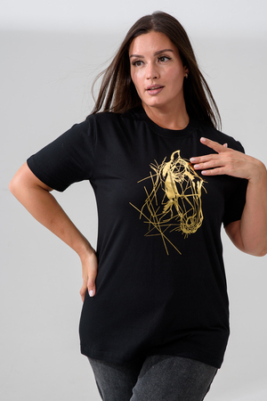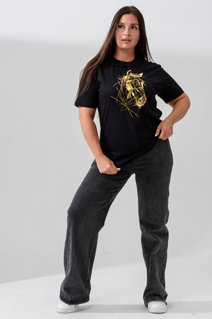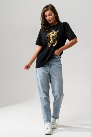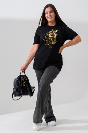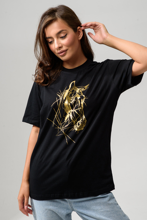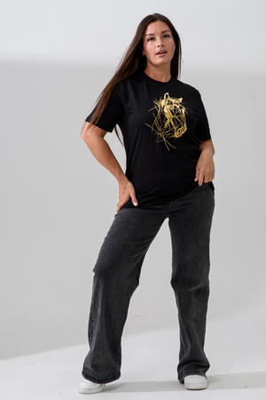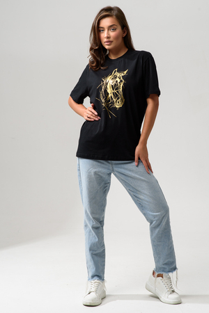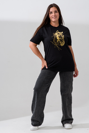 Футболка это идеальный выбор для женщин, предпочитающих комфорт и стиль. Сделанная из 100% хлопка, эта футболка обеспечивает отличную дышащую способность, делая её идеальной для домашнего использования, пляжного отдыха или просто для повседневного ношения. Уникальный принт на передней части добавляет элемент индивидуальности и стиля, делая эту футболку отличным дополнением к вашему гардеробу. Принт фольга.