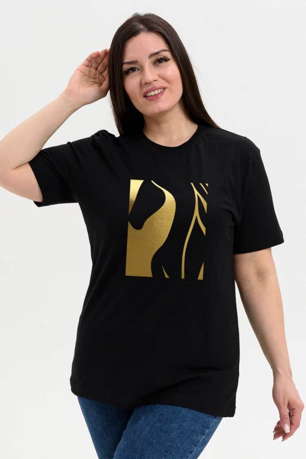 Футболка это идеальный выбор для женщин, предпочитающих комфорт и стиль. Сделанная из 100% хлопка, эта футболка обеспечивает отличную дышащую способность, делая её идеальной для домашнего использования, пляжного отдыха или просто для повседневного ношения. Уникальный принт на передней части добавляет элемент индивидуальности и стиля, делая эту футболку отличным дополнением к вашему гардеробу. Принт фольга.