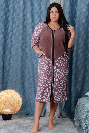Халат женский прямого силуэта из махровой ткани. Застежка на тесьму-молнию. Рукав-реглан. В фигурных швах нижней части полочки карманы с листочкой. Передняя часть рукава, нижняя часть полочки и спинка из контрастного полотна