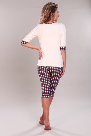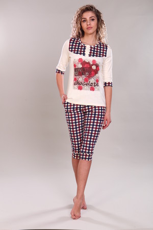 Элегантный женский комплект. Верх футболка с рукавами 3/4, украшенная модными клетчатыми вставками. Бриджи с классическим клетчатым узором гармонируют с декоративными элементами футболки. Модель выполнена из премиального интерлока. Идеально подходит для уютных вечеров и комфортного сна.