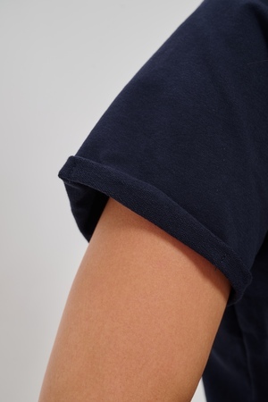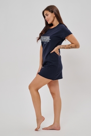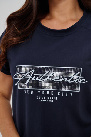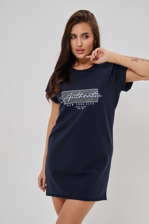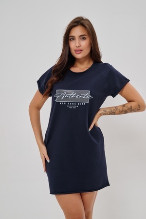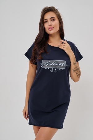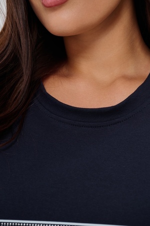 Женская туника-футболка выполнена в лаконичном стиле с прямыми линиями кроя. Ее отличает удобный фасон, подчеркивающий женственность фигуры. Модель оснащена круглым вырезом горловины и короткими рукавами типа реглан, обеспечивающими свободу движений и комфорт. Особенностью изделия является оригинальная отделка — низ туники оставлен с необработанными краями, создавая эффект легкой небрежности и современности. Центральное внимание привлекает стильный принт на груди с надписью, украшенный сверкающими стразами, придающий образу дополнительную яркость и шарм.