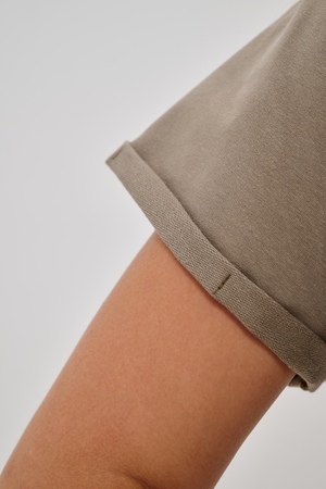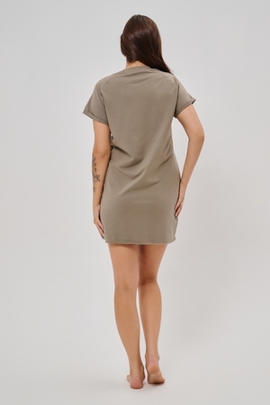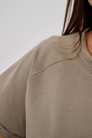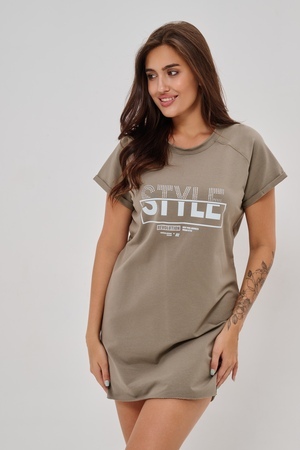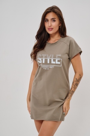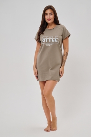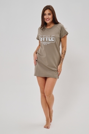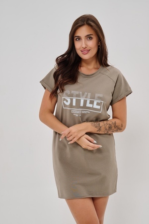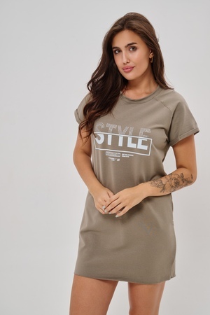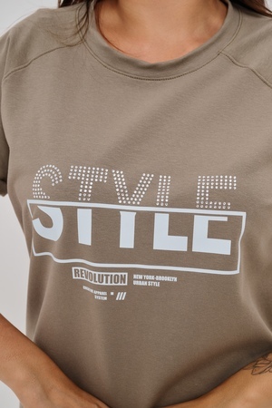 Женская туника-футболка выполнена в лаконичном стиле с прямыми линиями кроя. Ее отличает удобный фасон, подчеркивающий женственность фигуры. Модель оснащена круглым вырезом горловины и короткими рукавами типа реглан, обеспечивающими свободу движений и комфорт. Особенностью изделия является оригинальная отделка — низ туники оставлен с необработанными краями, создавая эффект легкой небрежности и современности. Центральное внимание привлекает стильный принт на груди с выразительной надписью "STYLE", украшенный сверкающими стразами, придающий образу дополнительную яркость и шарм.