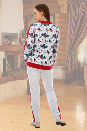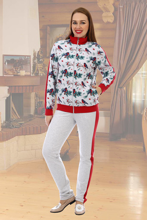 Посведневный костюм для прогулок и занятия спортом. Костюм из футера с лайкрой толстовка +брюки.Толстовка на молнии, дизайн "снегири", отделка воротника, манжетов, пояса и лампасы из контрасной ткани красного цвета. Рукава и брюки основного цвета ткани, длина брюк до щиколоток