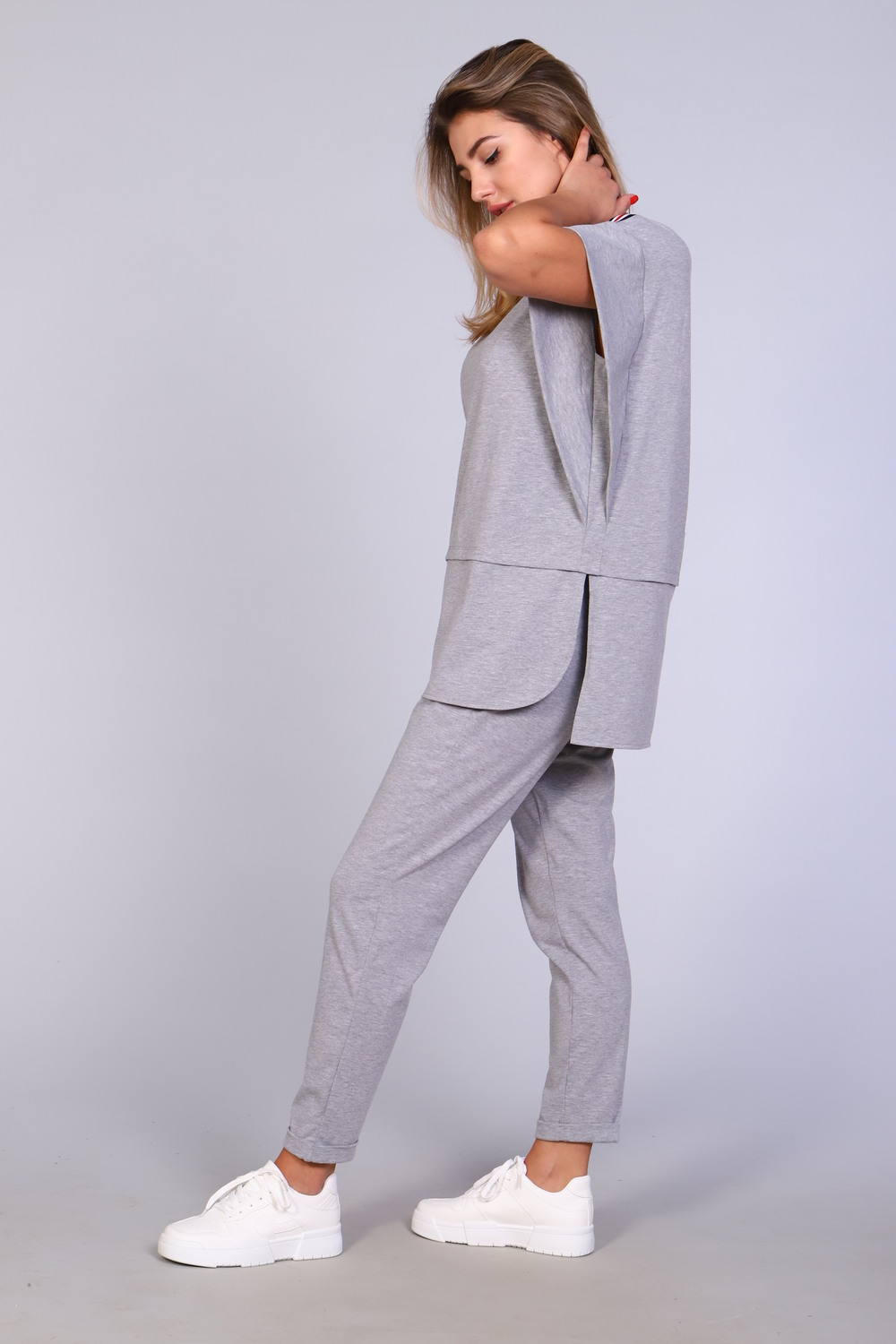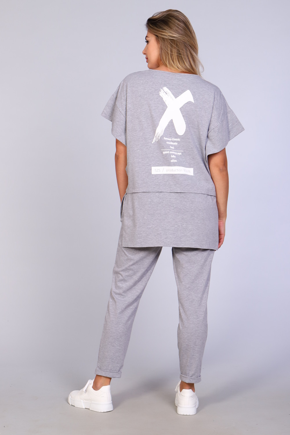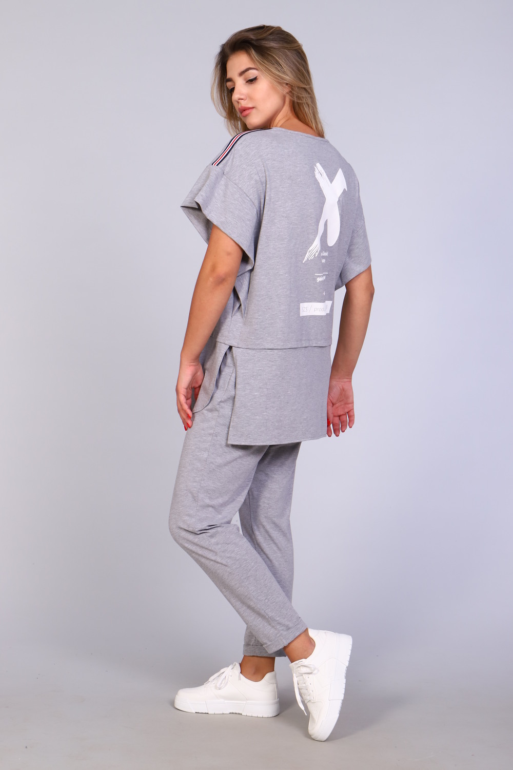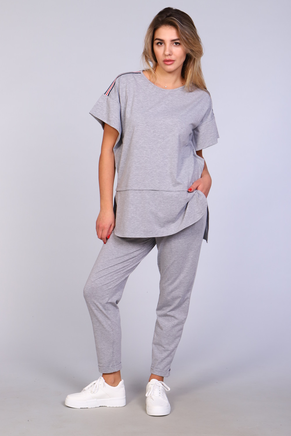 Костюм женский с зауженными брюками с подворотами, на резинке и свободной удлиненной футболкой с боковыми разрезами по бокам. Модель выполнена из премиального кулирного волокна с лайкрой.