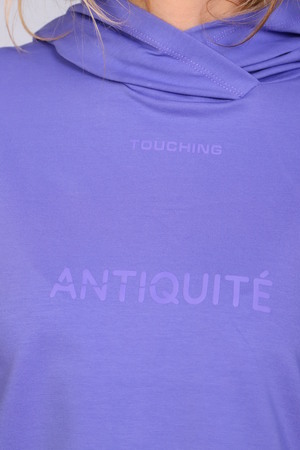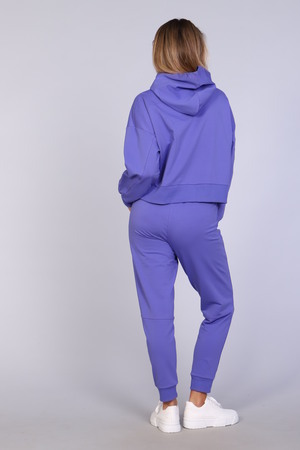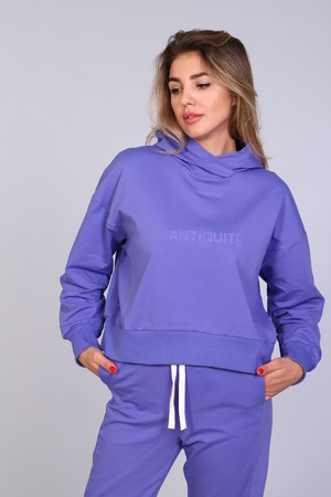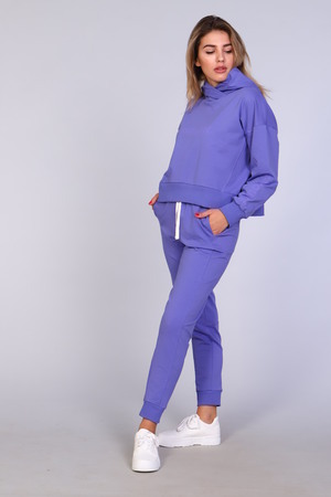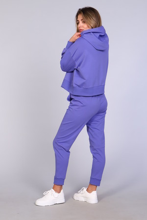 Костюм женский с зауженными брюками с манжетами внизу, на резинке и свободной кофтой с капюшоном и манжетами на рукавах. Модель выполнена из футера 2-х нитки (петля - хлопок).