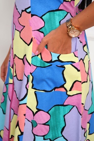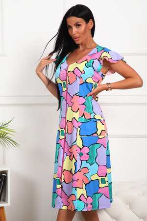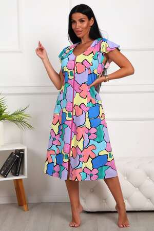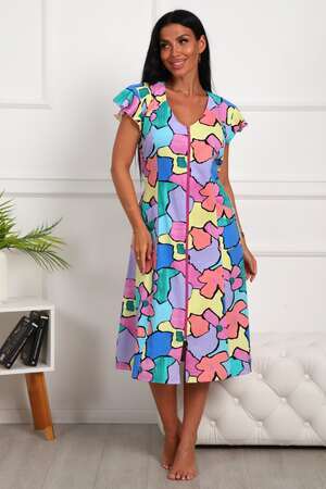Легкий женский халатик из натурального трикотажа. Приталенный с поясом в боковых швах. Удобные накладные карманы. Расклешённый к низу. Длина миди. Игривый рукав крылышко. Горловина V-образной формы. Для более комфортной посадки на фигуре, на полочках и спинке рельефные швы. Застежка на тесьму молнию.