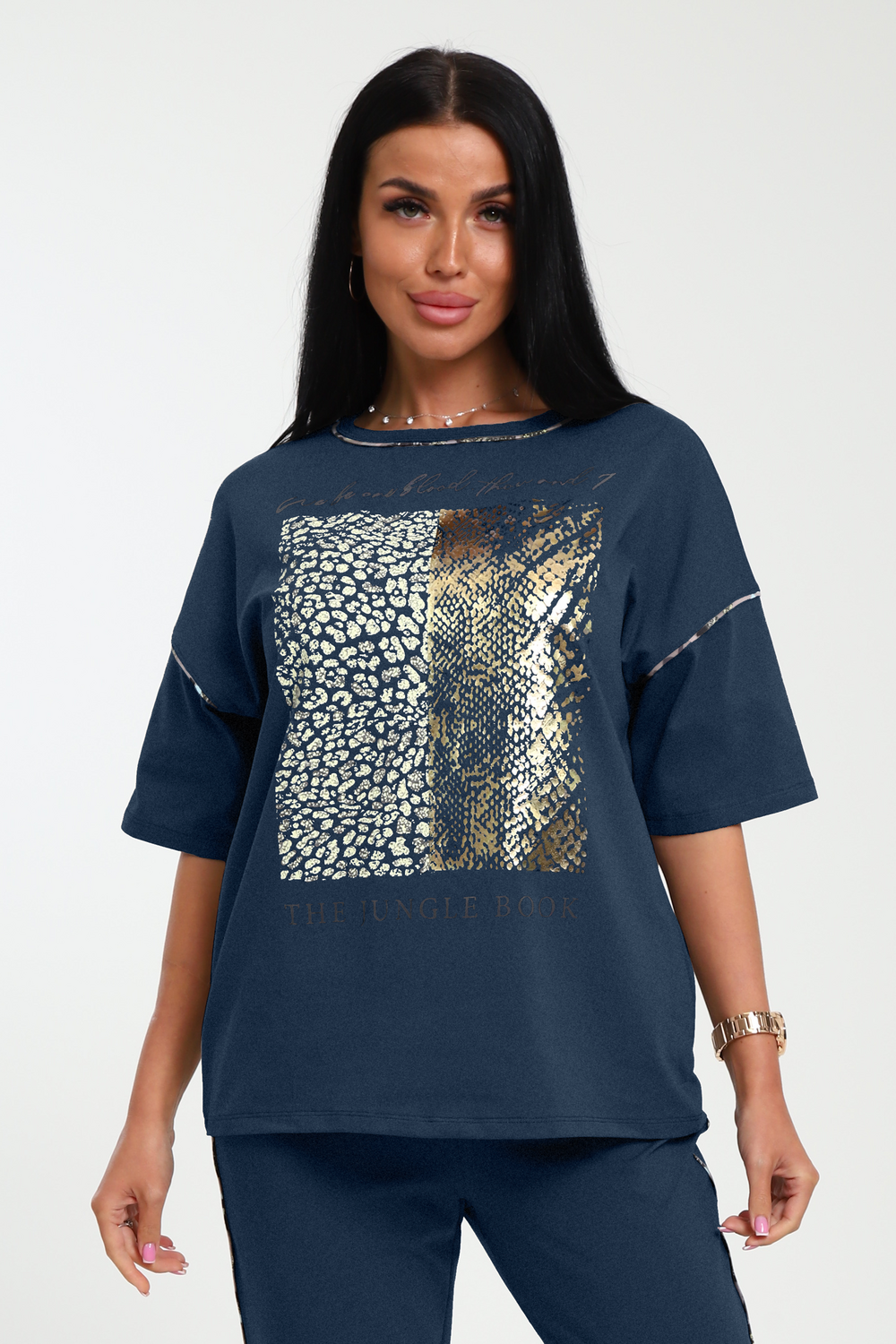 Трикотажная футболка премиум качества с модным принтом от NINEL. Модель выполнена из высококачественного кулирного волокна с лайкрой.