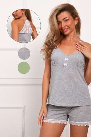 Пижама женская с шортами их натурального трикотажа. Хлопок 100% Майка с подрезом по линии груди и четырьмя защипами. По центру лифа два декоративных банта. Спинка отделана кружевом. Вырез горловины, пройма и бретели выполнены из окантовки. Силуэт чуть расклёшенный к низу. Низ топа прямой по форме и обработан швом в подгибку. Шорты прямые, короткие, без бокового шва и карман. Низ шорт украшен кружевом. Пояс цельнокроеный, на резинке.