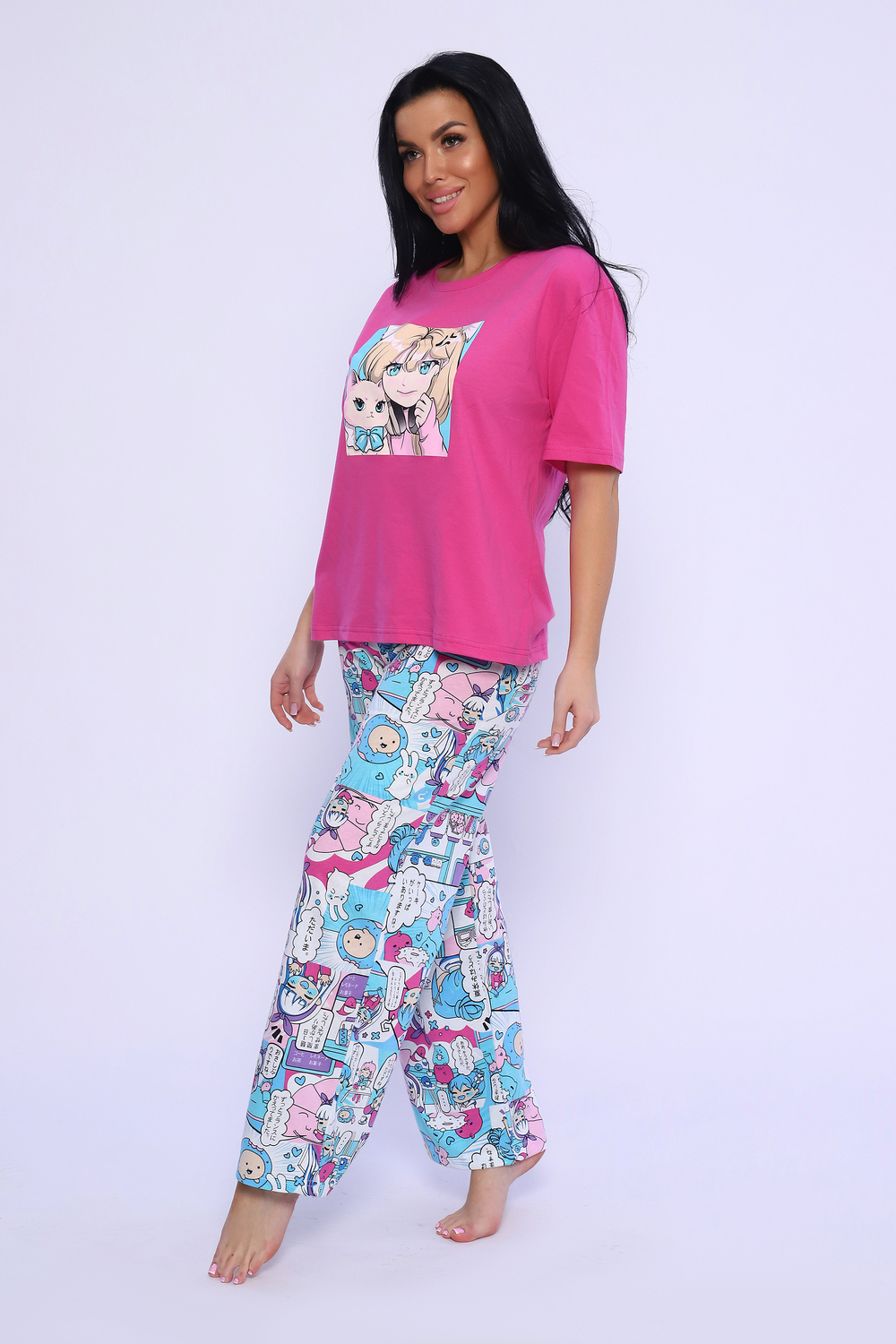 Костюм домашний, футболка прямого кроя с коротким рукавом и брюки свободного кроя.