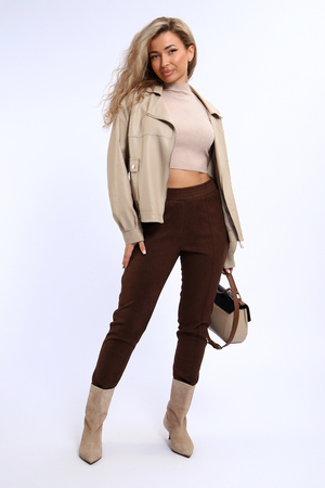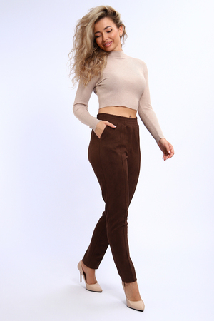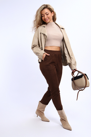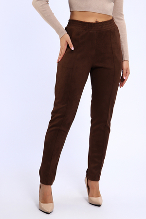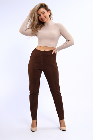 Удобные и практичные брюки из экозамши на все случаи жизни. Искуственая замша имеет приятную бархатистую поверхность, очень плотная, влагоустойчивая, хорошо тянется, проста в уходе. Брюки из этой ткани будут незаменимы в прохладное время года для прогулок и для офиса. Брюки прилегающего силуэта, средняя посадка, на передних половинках прострочены стрелки и обработана имитация гульфика. Удобный пояс на резинке, по бокам внутренние карманы. Брюки будут хорошо смотреться с обувью на каблуке и без каблука. Тем , кто желает более плотного прилегания по фигуре, советуем брать размер поменьше. В замерах обхват талии соответствует длине резинки в растянутом виде. Утюжить изделие лучше с изнанки или через ткань.