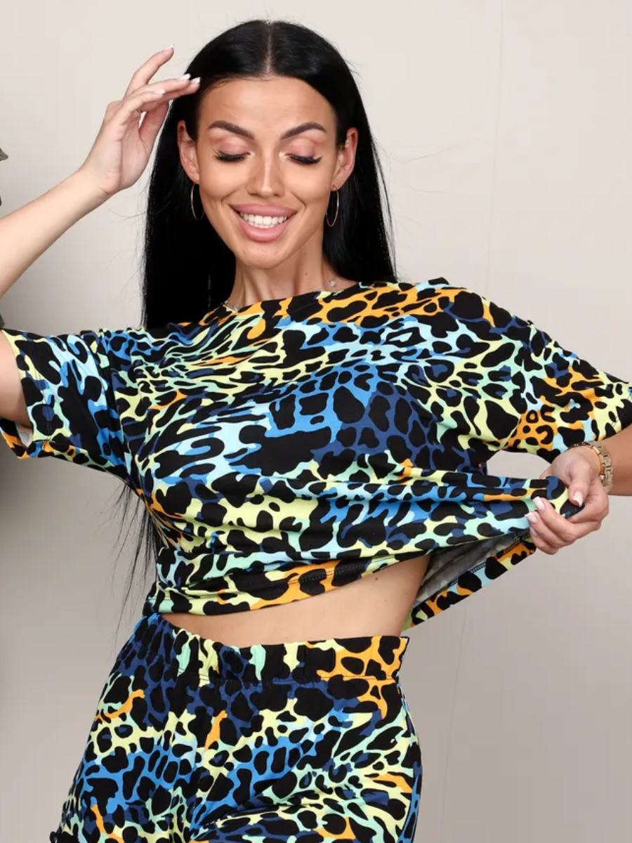 Представляем вашему вниманию стильный и удобный летний комплект от DANi.TEX BRAND - костюм из футболки и шорт. Этот яркий пижамный домашний костюм представлен в красивом молодежном стиле, что делает его отличным выбором для девушек. Футболка и шорты выполнены из 95%хлопка и 5% лайкры. Ткань пропускает воздух, впитывает влагу и приятна к телу, идеально подойдет как для домашнего отдыха, так и для сна. Костюм имеет свободный крой, который не обтягивает и позволяет свободно двигаться. Он подходит на любой рост и отлично сидит на фигуре. Футболка с круглым вырезом создает комфортное ощущение на шее, а шорты на резинке добавляют удобства и функциональности. Этот костюм легко ухаживать - достаточно бережной стирки при температуре до 30 градусов. Он отличается стильным дизайном с оригинальным рисунком леопардовый принт с привлекательным ярким цветом. Будьте в тренде с новой коллекцией от DANi.TEX BRAND! Этот товар является продукцией собственного производства бренда DANi.TEX BRAND, что гарантирует высокое качество и соответствие всем стандартам. Приобретая этот костюм, вы получите не только модный и красивый наряд, но и уверенность в его надежности и долговечности. Не упустите возможность приобрести эту новинку и добавить стильный элемент в свой гардероб!