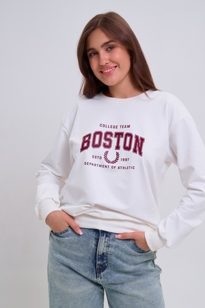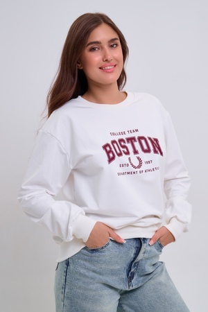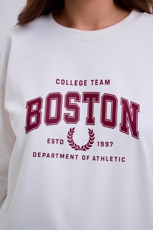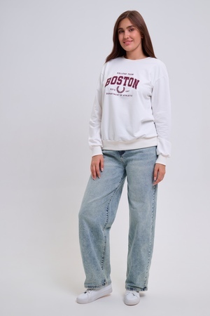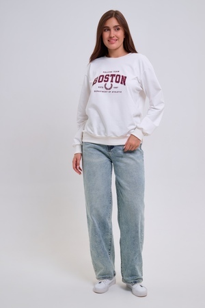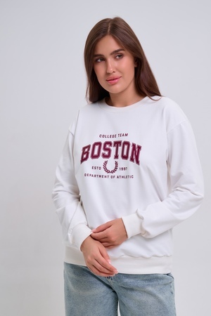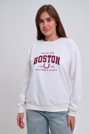Женский свитшот свободного прямого кроя с круглой горловиной и слегка приспущенными плечами. Спереди нанесён принт в виде надписи "Boston". Выполнен из мягкого и приятного материала — футера 2-х нитки, обеспечивающего дополнительный комфорт и сохранение тепла даже в холодную погоду. Доступен в сдвоенных размерах, что удобно для подбора идеальной посадки. Подходит как для повседневной носки, так и для создания эффектных образов в любом стиле.