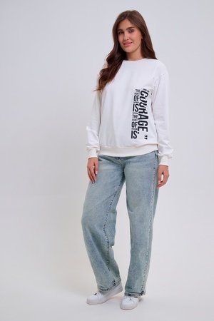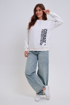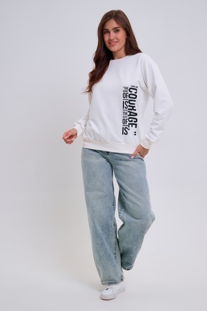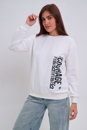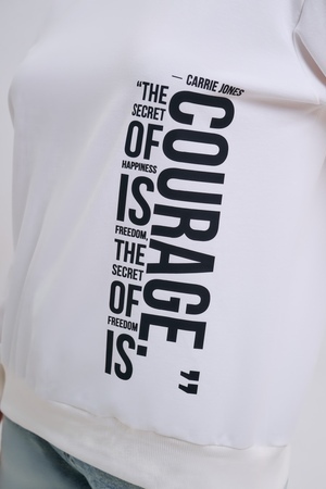 Женский свитшот свободного прямого кроя с круглой горловиной и слегка приспущенными плечами. Спереди нанесён принт в виде надписи "COURAGE". Выполнен из мягкого и приятного материала — футера 2-х нитки, обеспечивающего дополнительный комфорт и сохранение тепла даже в холодную погоду. Доступен в сдвоенных размерах, что удобно для подбора идеальной посадки. Подходит как для повседневной носки, так и для создания эффектных образов в любом стиле.