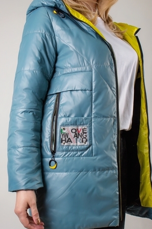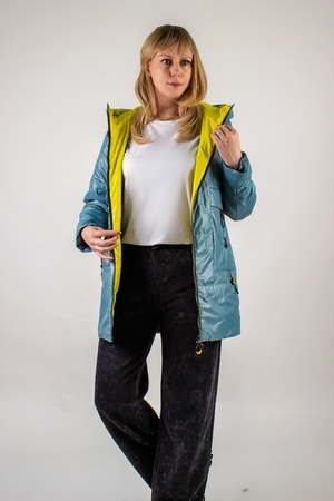 Основной цвет куртки – нежный, мягкий бирюзовый - этот трендовый оттенок прекрасно освежает образ и легко сочетается с любой одеждой. Особую пикантность и динамичность модели придает элегантный желтый акцент, который искусно интегрирован в дизайн. Он эффектно контрастирует с классической черной молнией, подчеркивая стиль и индивидуальность куртки. Желтый элемент также присутствует на части внутренней подкладки капюшона и части общей подкладки, создавая гармоничный и завершенный образ. Черные фиксаторы на капюшоне, выполненные в тон молнии, добавляют лаконичности и практичности.