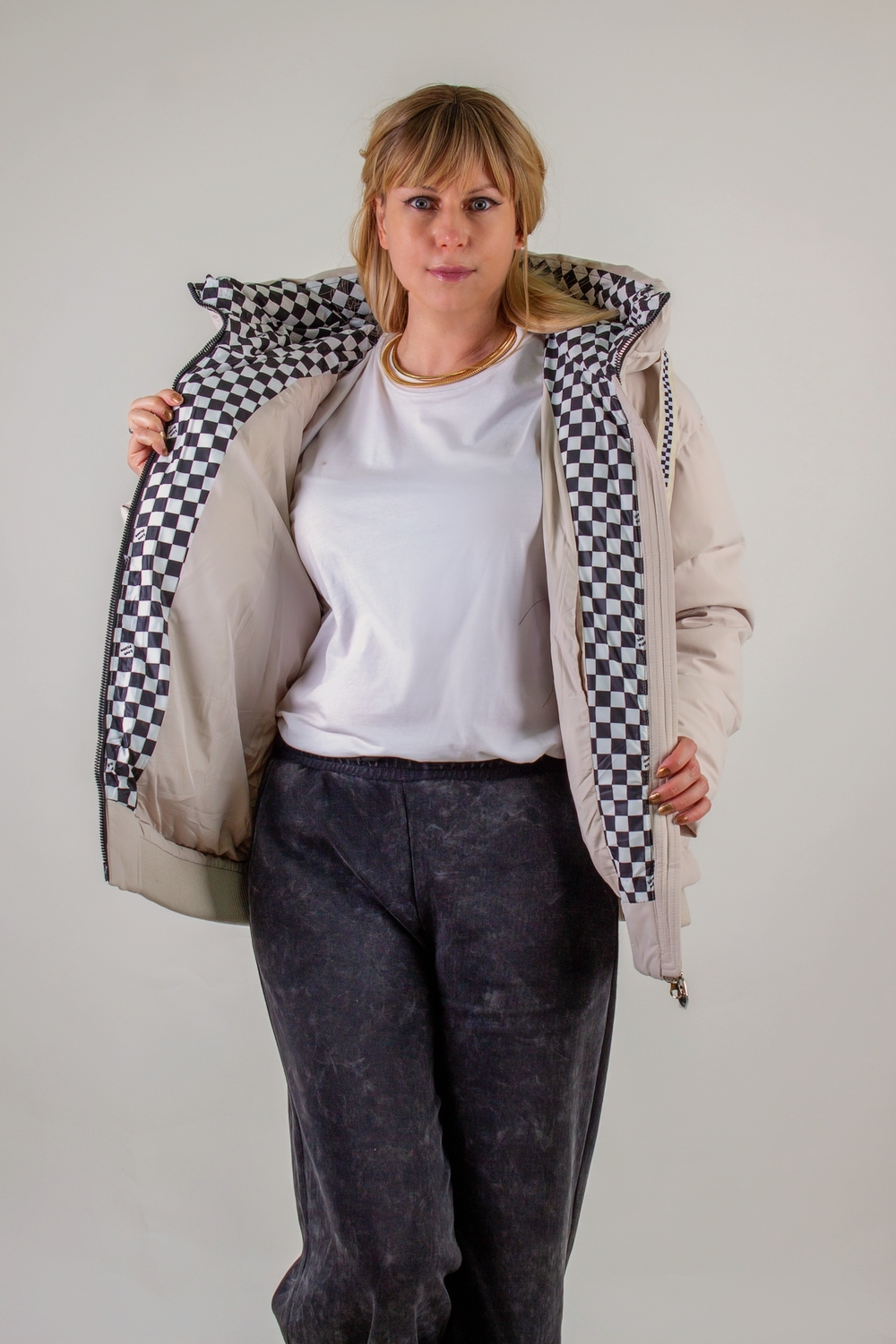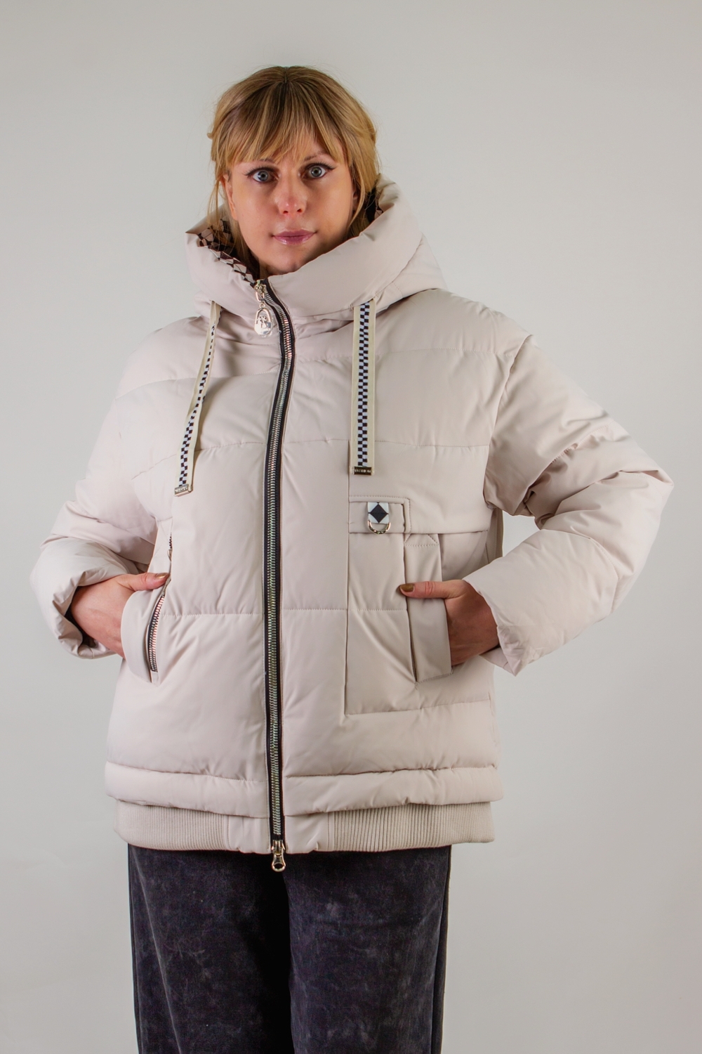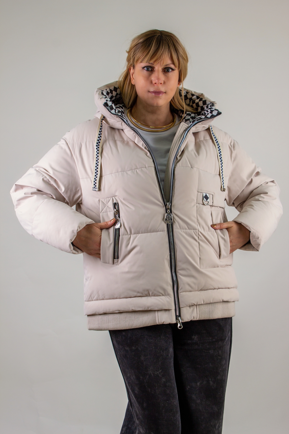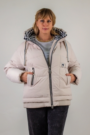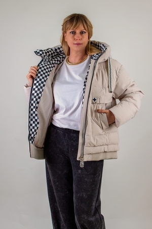 • Капюшон: объёмный, с регулировкой по глубине и окантовкой контрастным шнуром. Внутренняя отделка капюшона – оригинальный чёрно-белый шахматный принт, придающий модели дерзкий, игривый характер.